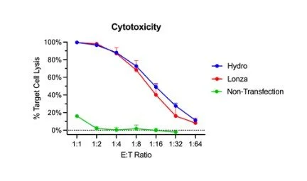 In regards to effector function, hydroporated and electroporated CAR-Ts performed similarly in a co-culture cytotoxicity assay. Target cell lysis ranged from 10% to 99% as the number of effector cells increased. Visually, the hydropore killing curve is superior for 1:8 to 1:32 effector to target ratios; however, there is no statistical significance (Figure 4).