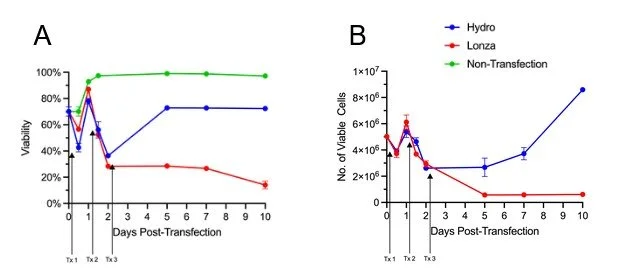 Figure 2. CAR-Ts transfected via hydroporation for three consecutive days showed greater viability and proliferation when compared to nucleofected cells. A) Viability comparison of T-cells transfected by hydroporation (Hydro; Blue) vs nucleofection (Lonza; Red) over ten days, with day of transfection indicated by arrows B) Proliferation of T-cells from day 0 (transfection) to day 10. All data points involve n = 3 biological replicates.